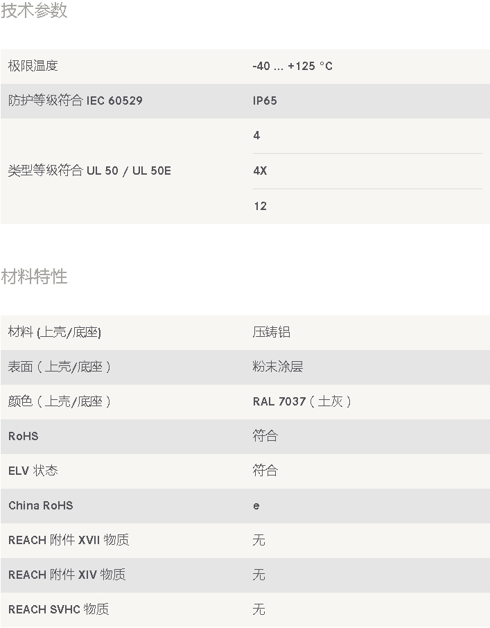 上壳, 尺寸: 32 A, 高结构, 双锁扣, 边出线, 1x Pg 29, 材料 (上壳/底座): 压铸铝, 粉末涂层, RAL 7037(土灰), 防护等级: IP65