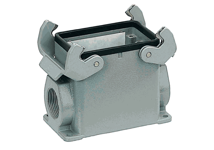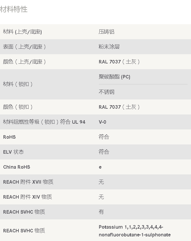 表面安装底座, 尺寸: 32 A, 高结构, 双锁扣, 聚碳酸酯 (PC), 不锈钢, 边出线, 2x Pg 21, 材料 (上壳/底座): 压铸铝, 粉末涂层, RAL 7037(土灰), 防护等级: IP65