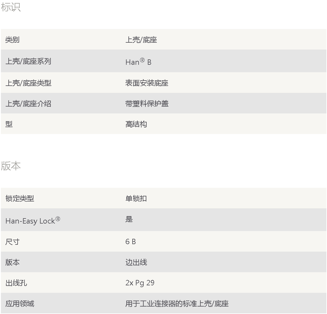 表面安装底座, 带塑料保护盖, 尺寸: 6 B, 高结构, 单锁扣, 聚碳酸酯 (PC), 不锈钢, 边出线, 2x Pg 29, 材料 (上壳/底座): 压铸铝, 粉末涂层, RAL 7037(土灰), 材料(密封件): NBR, 防护等级: IP65