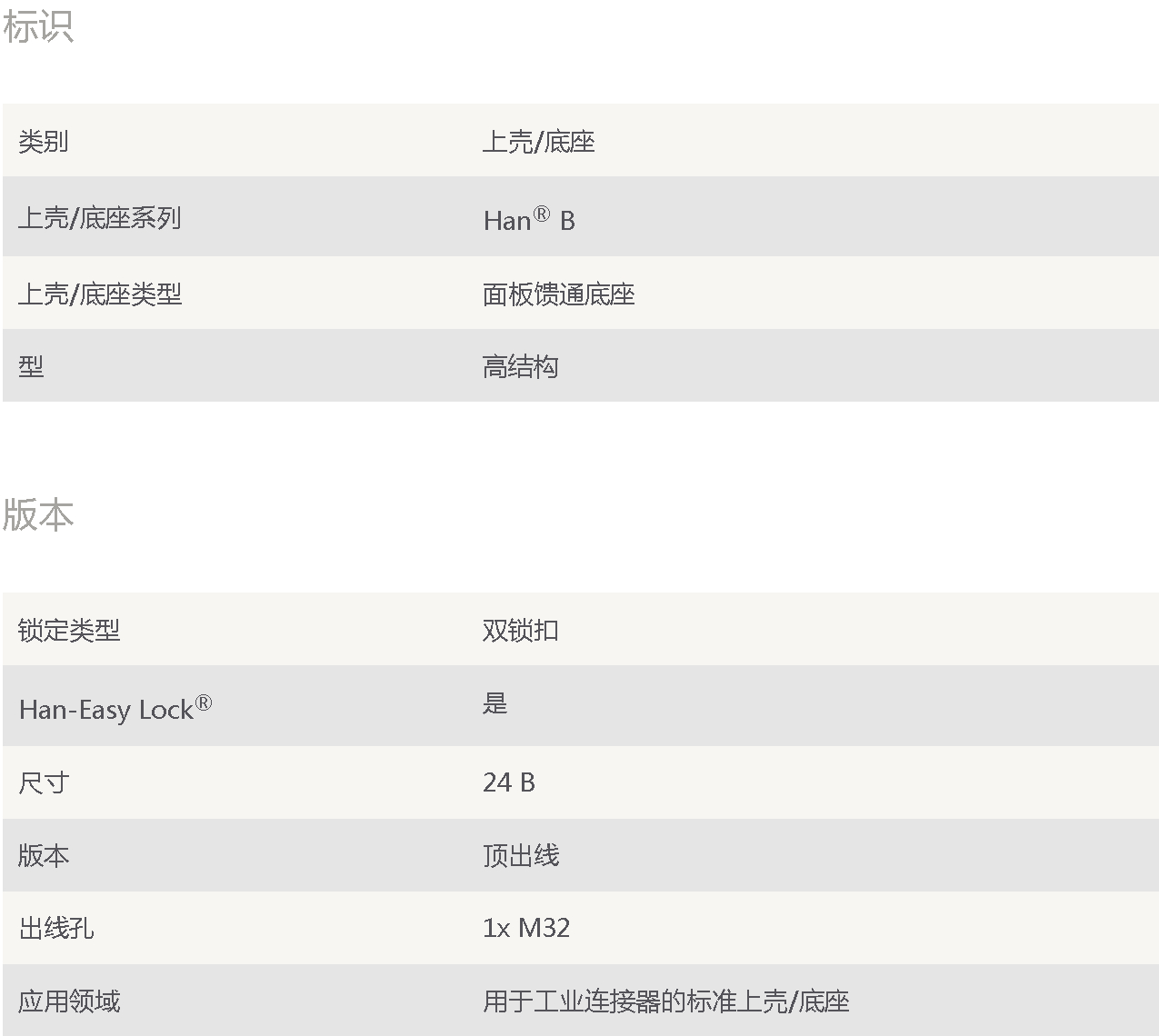 面板馈通底座, 尺寸: 24 B, 高结构, 双锁扣, 聚碳酸酯 (PC), 不锈钢, 顶出线, 1x M32, 材料 (上壳/底座): 压铸铝, 粉末涂层, RAL 7037(土灰), 材料(密封件): NBR, 防护等级: IP65