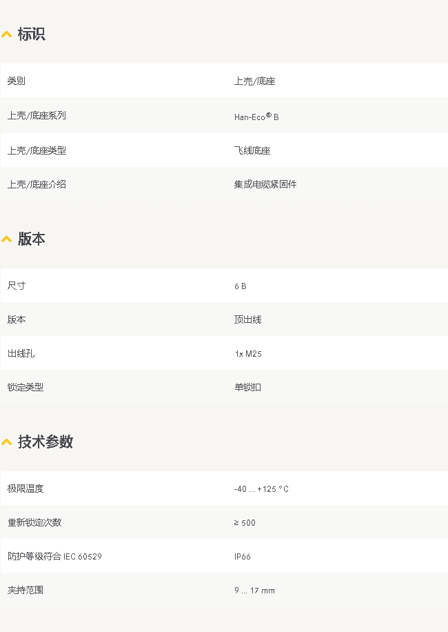 飞线底座 集成电缆紧固件 尺寸: 6 B 单锁扣 聚酰胺 (PA) 强化型玻璃光纤 顶出线 1x M25 材料 (上壳/底座): 聚酰胺 (PA) 强化型玻璃光纤 RAL 9005(乌黑) 材料(密封件): FPM