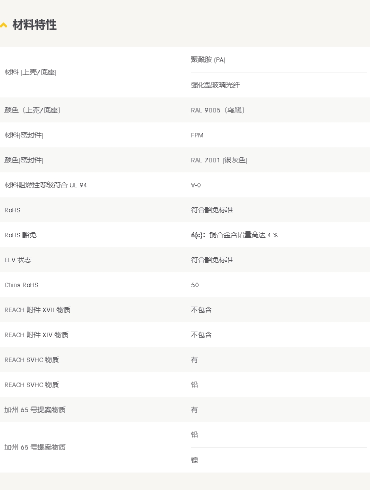 上壳 集成电缆紧固件 尺寸: 16 A 单锁扣 边出线 1x M20 材料 (上壳/底座): 聚酰胺 (PA) 强化型玻璃光纤 RAL 9005(乌黑) 材料(密封件): FPM